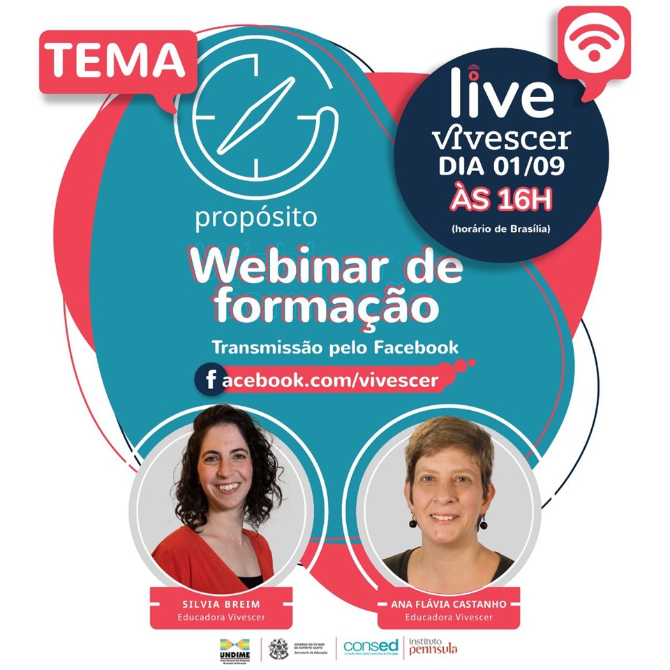 O quarto webinário de formação da plataforma Vivescer, com o tema “Propósito”, acontece na próxima terça-feira (01), às 16 horas. O debate é promovido pela Gerência de Estudos, Pesquisa, Qualidade e Desenvolvimento dos Profissionais do Magistério (Gedep), da Secretaria da Educação (Sedu), em parceria com a União Nacional dos Dirigentes Municipais de Educação (Undime) e com o Conselho Nacional de Secretários de Educação (Consed).