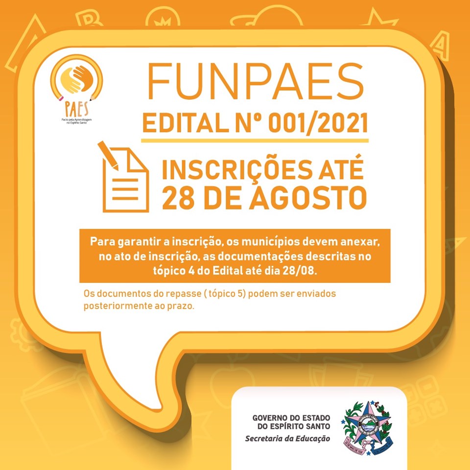 Os municípios do Estado têm até o próximo sábado (28) para fazer a inscrição e poder obter recursos financeiros do Fundo Estadual de Apoio à Ampliação e Melhoria das Condições de Oferta da Educação Infantil e do Ensino Fundamental no Espírito Santo (Funpaes). Para garantir a inscrição, devem ser anexadas, no ato da inscrição, as documentações descritas no tópico 4, do Edital nº 001/2021.