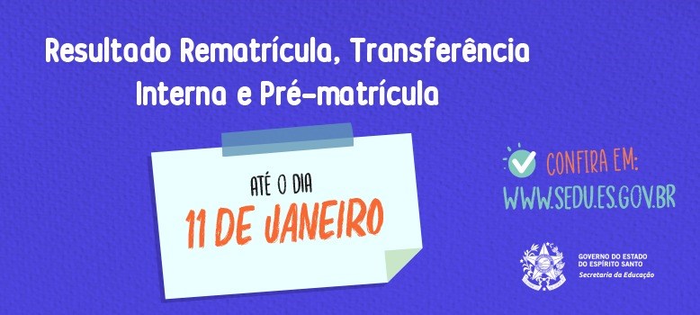 A Secretaria da Educação (Sedu) irá divulgar, até a próxima segunda-feira (11), o resultado da Rematrícula, Transferência Interna e Pré-Matrícula, da Chamada Pública 2021. Para efetivar a matrícula, o estudante deverá ir até a secretaria da escola onde conseguiu a vaga, entre os dias 12 e 25 de janeiro, portando os documentos necessários, que são: