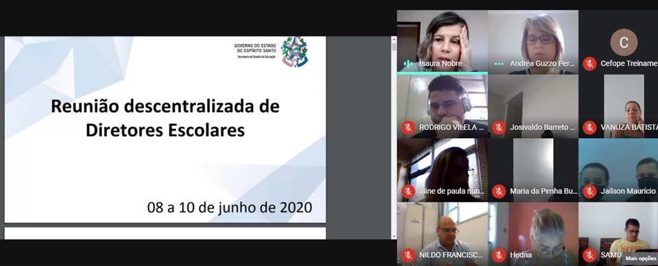 Por meio de videoconferência, a Secretaria da Educação (Sedu) realizou, na manhã desta segunda-feira (08), uma reunião com todos os diretores e supervisores escolares da região norte. Conduzida pela Assessoria de Gestão Escolar, o encontro teve a participação dos subsecretários Josivaldo Andrade, Aurélio Meneguelli, Andréa Guzzo e Isaura Nobre, que fizeram um balanço do que cada área tem desenvolvido neste período de pandemia.