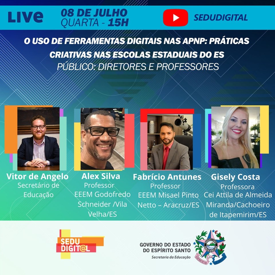 Participam da live o secretário da Educação, Vitor de Angelo, e três professores convidados: Alex Silva, da Escola Estadual de Ensino Médio (EEEM) Godofredo Schneider, de Vila Velha; Fabrício Antunes, da (EEEM) Misael Pinto Netto, de Aracruz; Gisely Costa, da (EEEM) Centro Interescolar Áttila de Almeida Miranda, em Cachoeiro de Itapemirim.