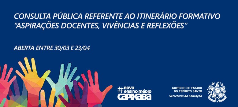 A Secretaria da Educação (Sedu), por meio da Subsecretaria da Educação Básica e Profissional, e da Assessoria de Apoio Curricular e Educação Ambiental, convida professores, equipe pedagógica, pais e comunidade em geral a participarem da Consulta Pública, referente ao Itinerário Formativo “Aspirações Docentes, Vivências e Reflexões”. O período da consulta pública termina nesta sexta-feira (23), pelo link: https://curriculo.sedu.es.gov.br/curriculo/consulta-itinerario-docencia/.