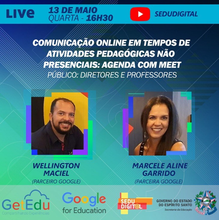 Nesta quarta-feira (13), a Sedu Digital, da Secretaria da Educação (Sedu), promove a live “Comunicação Online em tempos de Atividades Pedagógicas em momentos Não Presenciais: Agenda MEET”, com Wellington Maciel e Marcele Aline Garrido, que são parceiros Google. Será às 16h30, no canal do Youtube da Sedu Digital. O conteúdo será direcionado para diretores e professores da Rede Estadual de Ensino.