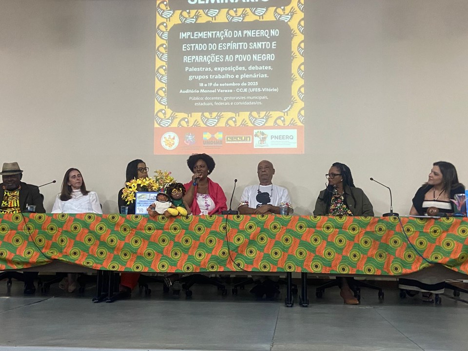 A Secretaria da Educação (Sedu), por intermédio Comissão Permanente de Estudos Afro-brasileiros (Ceafro), integrada à Gerência de Educação Antirracista, do Campo, Indígena e Quilombola (Geaciq), organizou em parceria com o Centro de Estudos da Cultura Negra no Estado do Espírito Santo (Cecun) e com a União Nacional dos Dirigentes Municipais de Educação (Undime) o seminário “Implementação da PNNERQ no estado do Espírito Santo e Reparações ao povo negro”. O encontro, realizado na Universidade Federal do Espírito Santo (Ufes), campus de Goiabeiras, em Vitória, nos dias 18 e 19 de setembro, reuniu técnicos/as pedagógicos/as referências em ERER, professores/as coordenadores/as de Estratégias para Equidade Racial, docentes, gestoras/es municipais, estaduais, federais e convidadas/os.