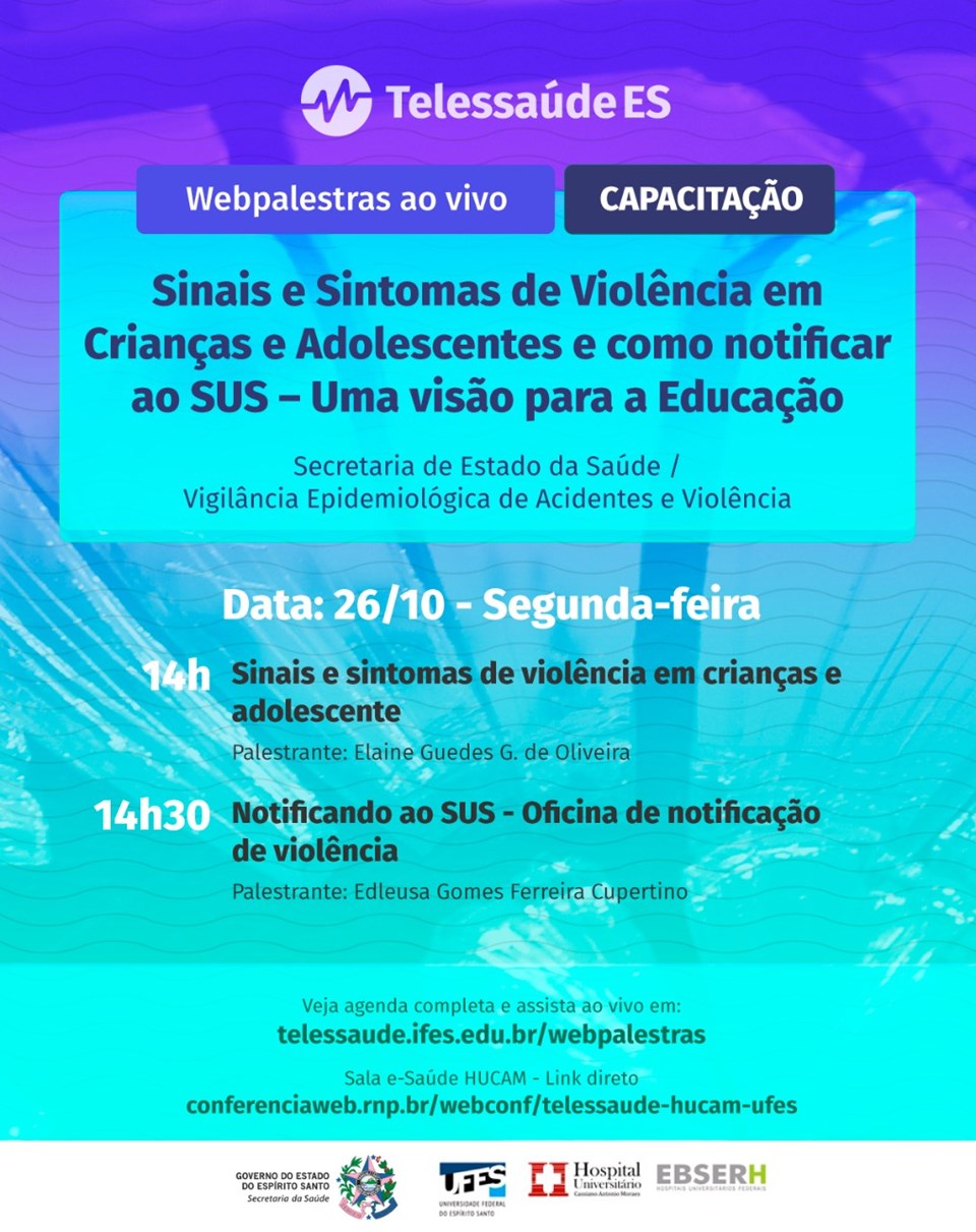 A Secretaria da Educação (Sedu), por meio da Ação Psicossocial e Orientação Interativa Escolar (Apoie), em parceria com a Secretaria da Saúde (Sesa), promovem uma formação sobre os “Sinais e Sintomas de Violência em Crianças e Adolescentes”. A ação formativa será realizada através de duas webpalestras, na próxima segunda-feira (26).