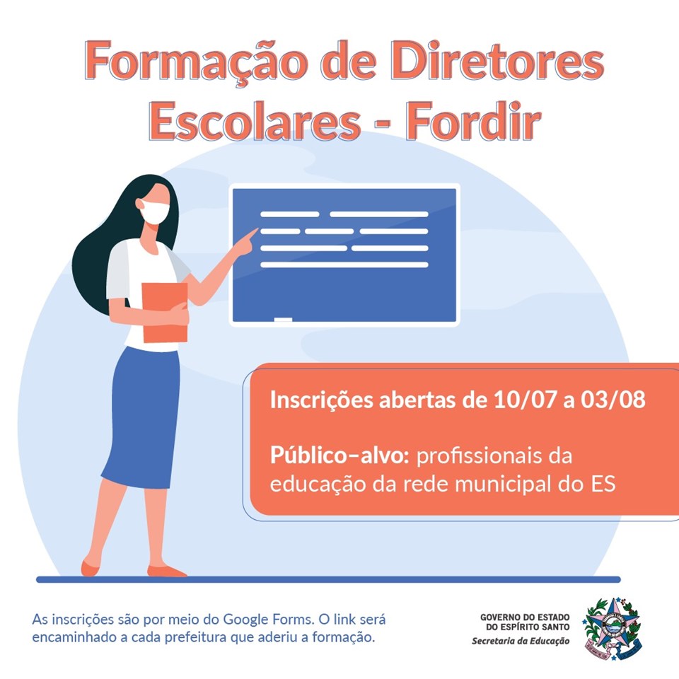 A Secretaria da Educação (Sedu), por meio da Gerência de Qualificação Profissional (Gepro), do Centro de Formação de Profissionais da Educação (Cefope) e da Coordenação do Pacto pela Aprendizagem no Espírito Santo (Copaes) ofertará a Formação de Diretores Escolares (Fordir), uma ação que faz parte das estratégias do Programa de Fortalecimento da Gestão Escolar, voltada para a aprendizagem e para a educação de qualidade no Espírito Santo. As inscrições serão abertas neste sábado (10), por meio de formulário. O link será encaminhado para cada prefeitura que aderiu à formação.