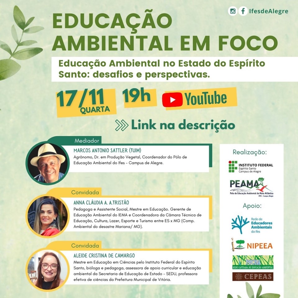 As ações de Educação Ambiental realizadas pela Secretaria da Educação (Sedu) estarão em pauta durante a Live Educação Ambiental em Foco - Educação Ambiental no Espírito Santo: desafios e perspectivas. Será nesta quarta-feira (17), às 19 horas, no canal do Instituto Federal do Espírito Santo (IFES) - Campus Alegre - no Youtube CLIQUE AQUI (https://bit.ly/3FCXt7l).