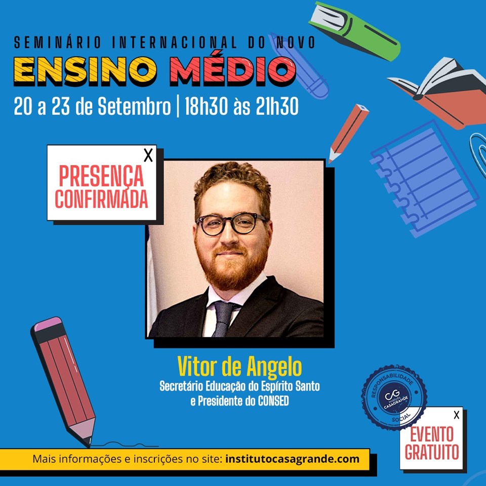 A Secretaria da Educação (Sedu) participa do Seminário Internacional do Novo Ensino Médio, com o tema “Proposta de implantação do Novo Ensino Médio nos estados brasileiros”. A programação tem início, nesta segunda-feira (20), e segue até a quinta-feira (23). Para participar é necessário se inscrever pelo link: https://conteudo.institutocasagrande.com/seminario-internacional-do-novo-ensino-medio.