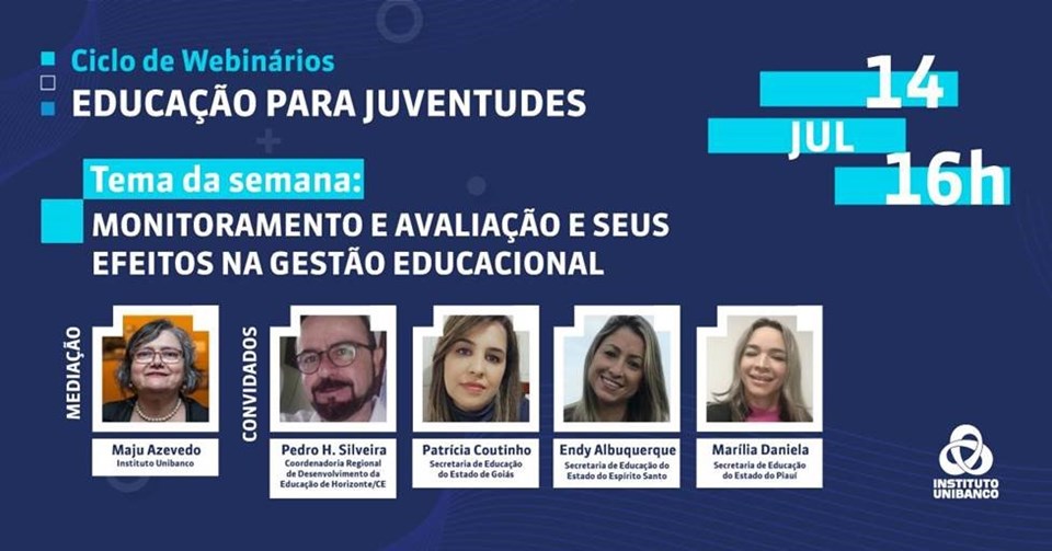 A Secretaria da Educação (Sedu) participa, nesta quarta-feira (14), do webinário “Monitoramento e Avaliação e seus efeitos na gestão educacional”, que integra o Ciclo “Educação para Juventudes”, promovido pelo Instituto Unibanco. A representante da Sedu para debater o tema será a gerente de Avaliação, Endy de Albuquerque. O webinário será transmitido ao vivo, a partir das 16 horas, no canal do Instituto Unibanco no YouTube, com tradução em libras.