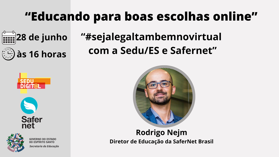 A Secretaria da Educação (Sedu), por meio da equipe Sedu Digital, promoverá, nesta segunda-feira (28), o webinário “Educando para boas escolhas on-line”, que abordará o tema internet segura e contará com a presença do diretor de Educação da SaferNet Brasil, Rodrigo Nejm. O convidado coordena ações de promoção do uso crítico e responsável da internet e o Safer Internet Day no Brasil.