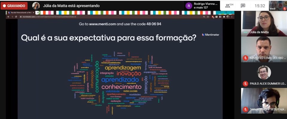 Participaram da formação o coordenador da Educação de Tempo Integral da Sedu, Marcelo Lema, e a coordenadora de Comunicação da Sedu, Mirela Marcarini. A apresentação sobre o uso e as funcionalidades do Instagram foi conduzida pela trainee de Gestão Pública e Analista de Projetos da Sedu, Júlia da Matta Machado de Paula.