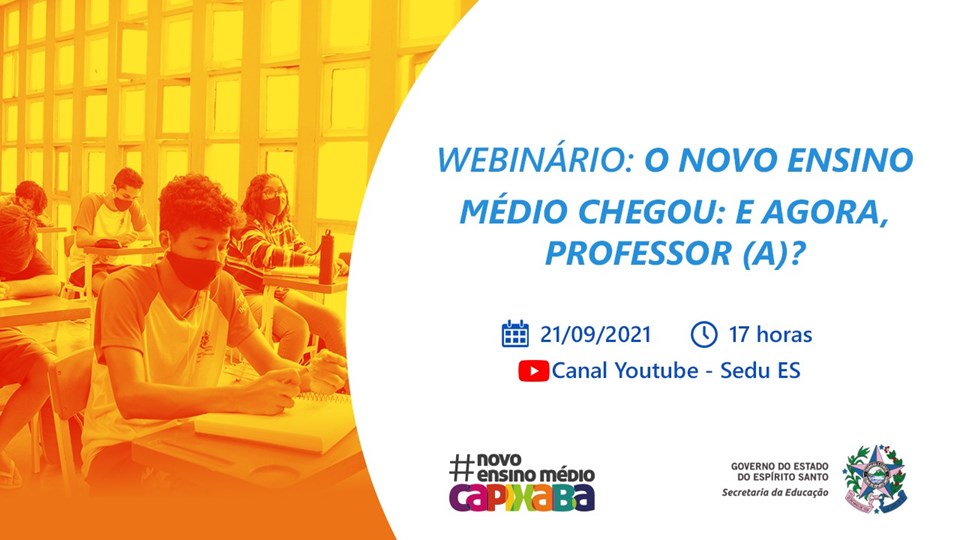 A Secretaria da Educação (Sedu) convida para o I Webinário acerca da Formação do Novo Currículo do Espírito Santo para o Ensino Médio, intitulado “O Novo Ensino Médio chegou: e agora, professor(a)?”que vai acontecer na próxima terça-feira (21), às 17 horas, no Canal da Sedu no YouTube.