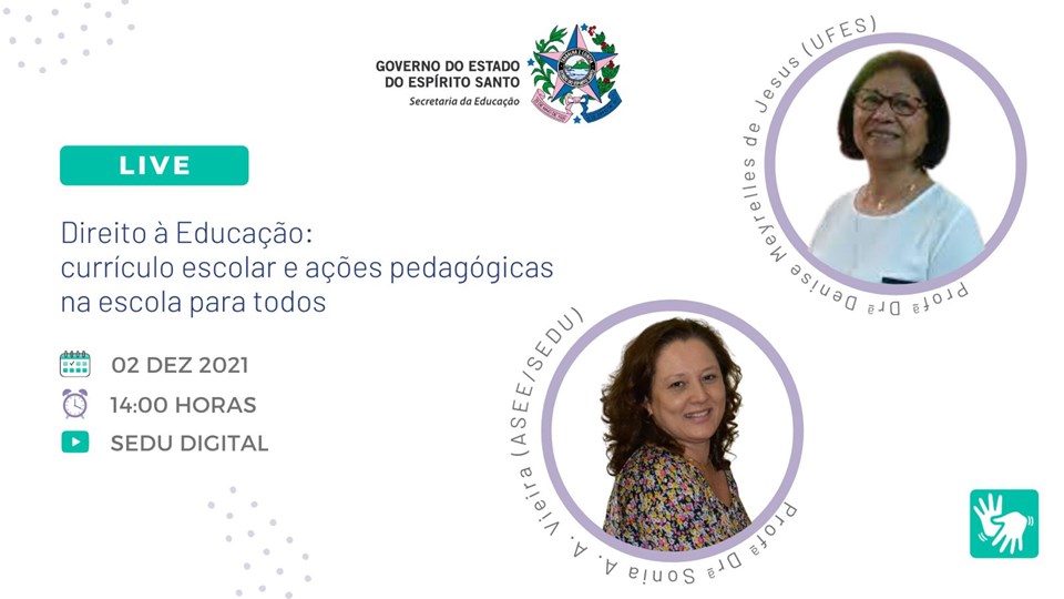 A Secretaria da Educação (Sedu), por meio da Assessoria de Educação Especial, realiza, nesta quinta-feira (02), uma live com o tema “Direito à Educação: currículo escolar e ações pedagógicas na escola para todos”. A transmissão será no canal da Sedu Digital no YouTube, às 14 horas.
