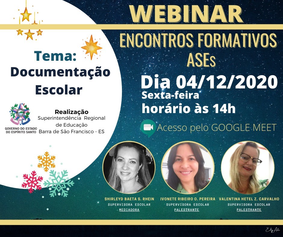 A Superintendência Regional de Educação (SRE) Barra de São Francisco realiza, nesta sexta-feira (04), um encontro formativo para os auxiliares de Secretaria Escolar (ASE), com o tema “Documentação Escolar”. A transmissão será pelo Google Meet, às 14 horas.