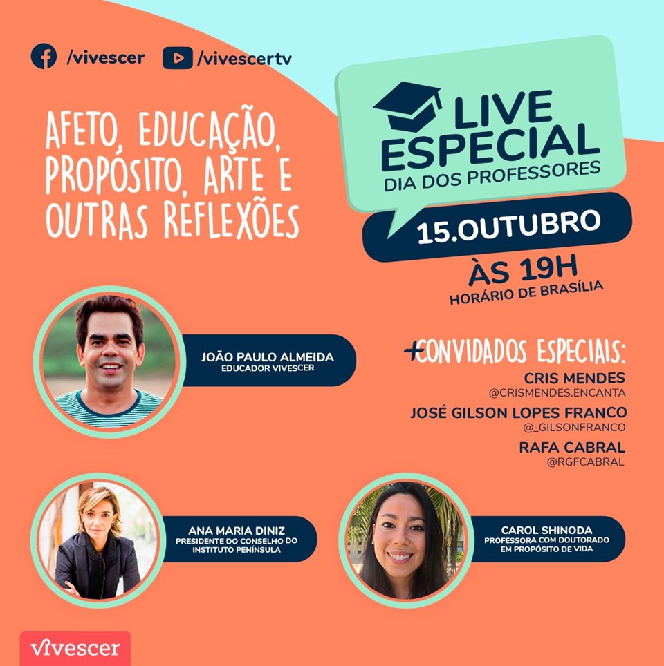 A plataforma Vivescer realizará nesta quinta-feira (15), quando é celebrado o Dia do Professor, uma live especial com o tema “Afeto, Educação, Propósito, Arte e outras reflexões”. A transmissão será às 19 horas, por meio do Facebook (https://www.facebook.com/Vivescer) e pelo YouTube (https://www.youtube.com/channel/UCQ-GDzS4a-y3Sb17uYfK_2g) da plataforma.