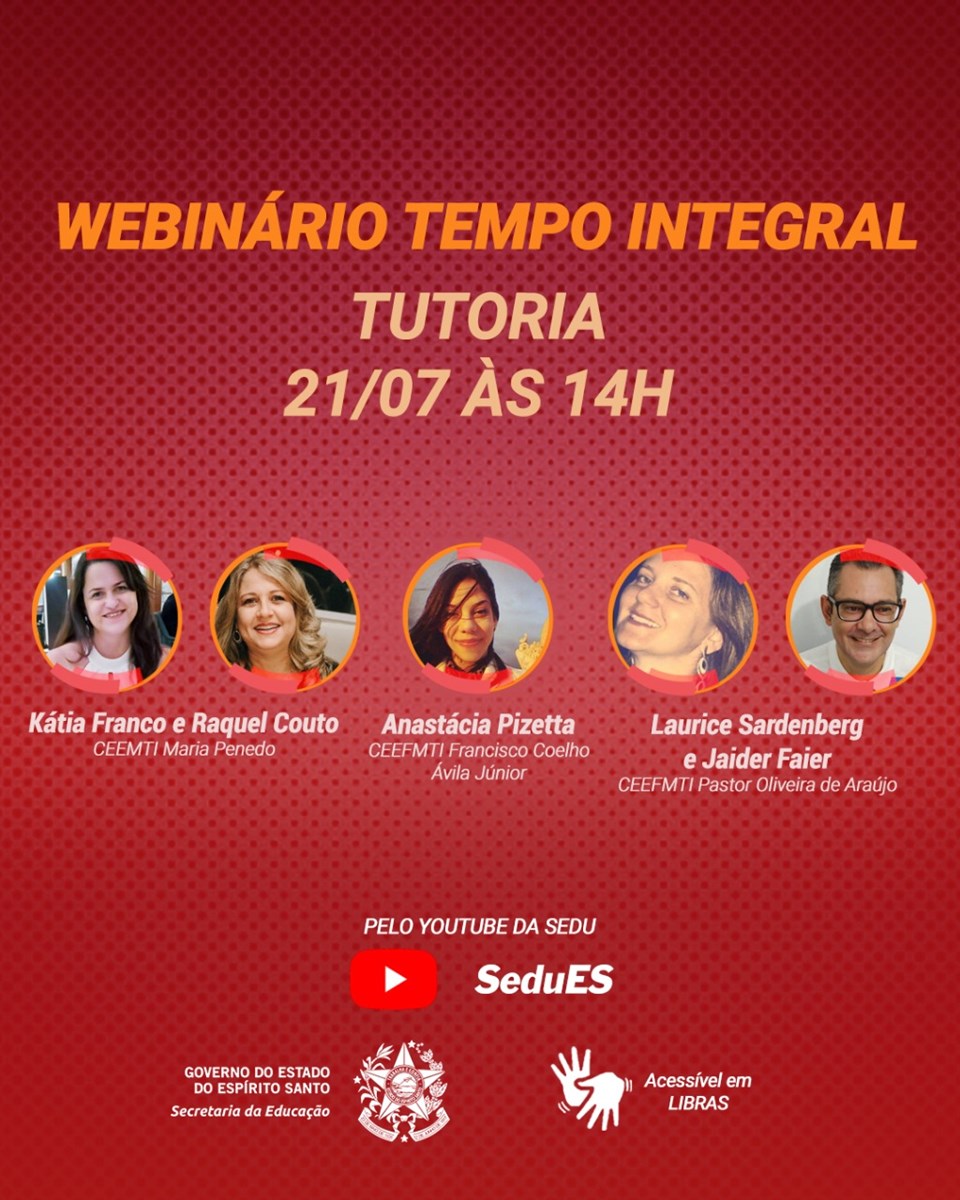 Cada um dos eventos será conduzido pela Assessoria Especial de Educação em Tempo Integral, com duração máxima de 1h30. Serão preparadas perguntas para serem feitas aos convidados, bem como monitoradas as perguntas do chat. A intenção é que o debate seja mais interativo e de formação, com o compartilhamento de experiências das escolas. Nesta terça-feira (21), participam a coordenadora Pedagógica  Laurice Sardenberg, do Centro Estadual de Ensino Fundamental e Médio de Tempo Integral  (CEEFMTI) Pastor Oliveira de Araújo, de Vila Velha; o professor da mesma escola Jaider Faier; a diretora Kátia Franco, do CEEMTI Maria Penedo, de Cariacica; a coordenadora pedagógica da mesma escola Rachel Couto; e a pedagoga Anastacia Pizetta, do CEEFMTI Francisco Coelho Ávila Júnior, de Cachoeiro de Itapemirim.